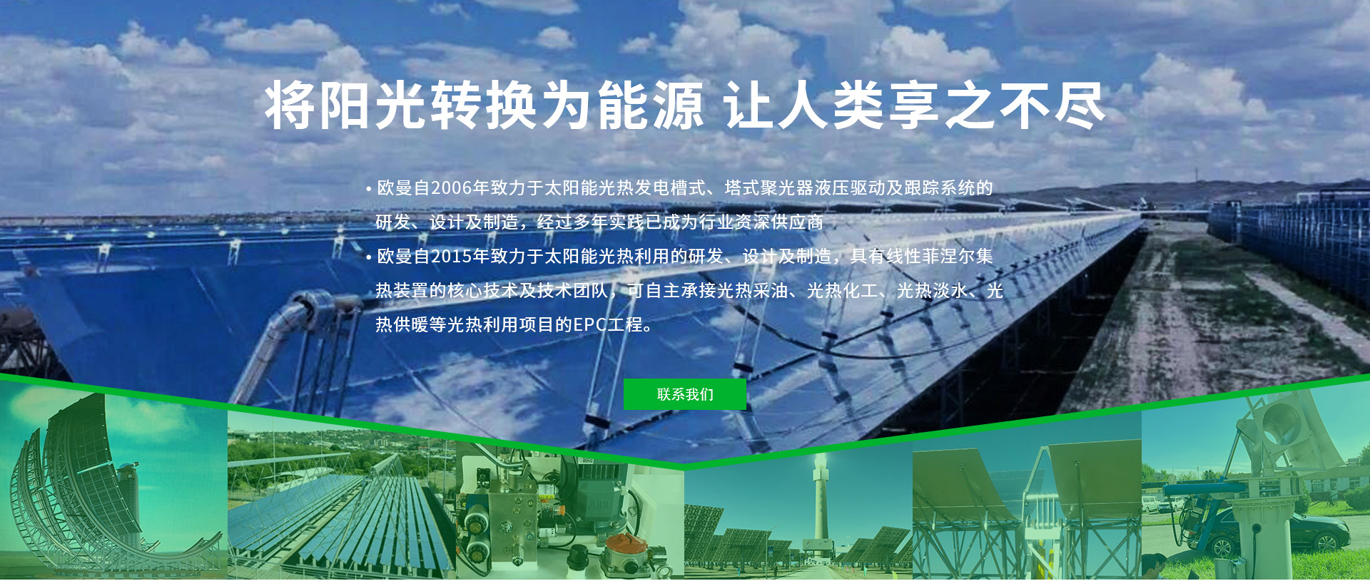 欧曼新能源技术(天津)有限公司其生产基地坐落于美丽的渤海之滨秦皇岛海港区高新技术产业园区,占地20000㎡。公司总部位于天津空港自贸经济区中兴产业基地,注册资金1000万元。公司集研发、设计、制造、贸易服务为一体,专业从事大中型液压系统、泵站、液压成套设备、液压机、电液比例伺服控制系统,液压润滑系统及泵站,各类非标气动控制系统,各类非标液压缸的设计与制造。近年公司投身环保新能源开发领域,致力于太阳能光热发电槽式、塔式聚光器液压驱动及逐日跟踪控制系统的研发、设计及制造,经过多年实践已成为行业资深供应商。同时在太阳能中低温利用的菲涅尔集热方式EPC项目上加大研发投入,可以承接包括油田、农牧业、养殖业、海水淡化、企业院校、水上游乐场等场所太阳能供暖、取暖、供汽的项目。